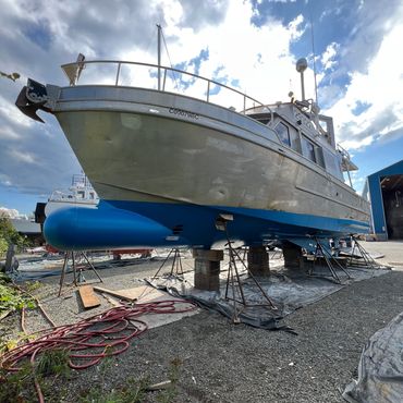 Performed surface prep and applied a fresh coat of antifouling paint to restore smoothness and underwater protection.