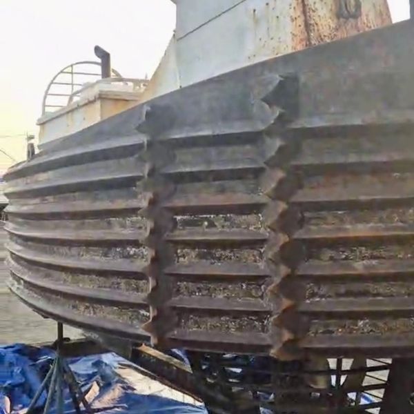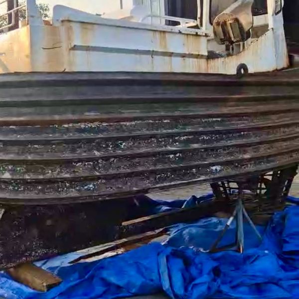Complete wet blasting of the steel hull and topside to remove heavy rust and buildup. Applied Intershield 300HS epoxy primer for corrosion protection, followed by Interlux 990 — black on the hull and white on the topside.